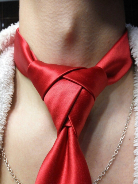 В результате правильно проделанных манипуляций получается интересный узел, напоминающий треугольник. Не переживайте, если стороны получатся не идеально ровными, так и должно быть, ведь материал имеет различную ширину. «Четвертной» идеально подходит к любому воротнику, придает образу одновременно легкую небрежность и элегантность.