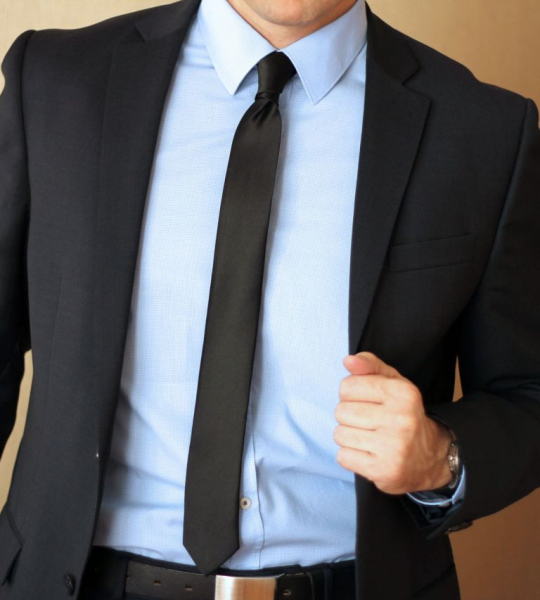Общепринятое правило – ширина галстука должна быть максимально близка к ширине лацканов. Поэтому до недавнего времени узкий аксессуар носили исключительно под однобортный пиджак с одной или двумя пуговицами.