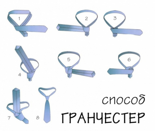 Интересно! Узел «Гранчестер» лучше всего сочетается с удлиненными вариантами галстука и рубашками с воротником типа «акула», а также подходит мужчинам среднего роста.