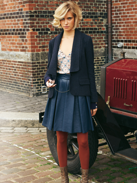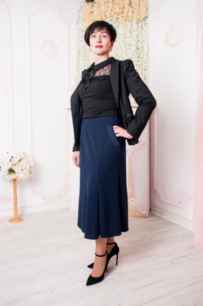 - Пиджак с миди или макси юбкой. Можно подчеркнуть талию узким ремешком, или широким ремнем с квадратной пряжкой. Тут также важна правильная комбинация тканей. К примеру, к трикотажной юбке наденьте шерстяной пиджак, а к атласной – вязаный жакет.