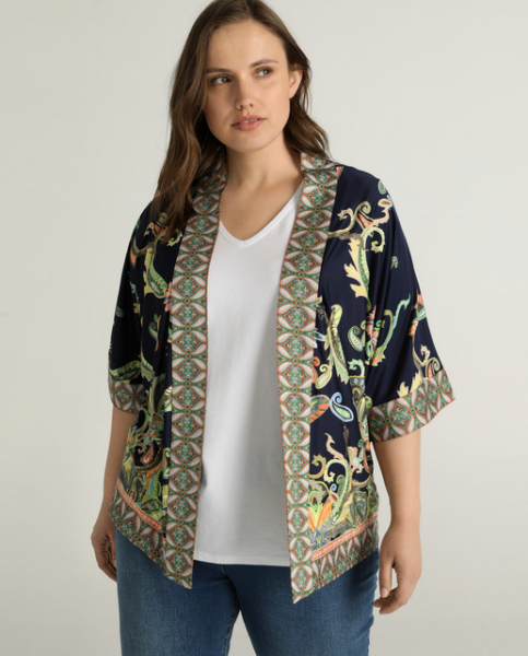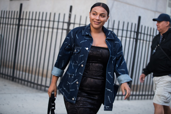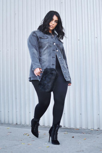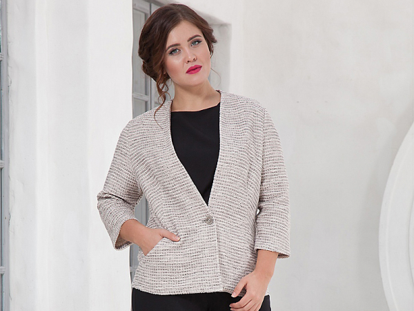 - Из плотных тканей. Отличное модное решение – джинсовый жакет. На зиму же стоит выбирать шерстяные пиджаки. А вот букле и твид дамам с формами не очень идут. Стрейчевую ткань также исключаем из списка. Наиболее подходящий для вас прямой или полуприлегающий силуэт.