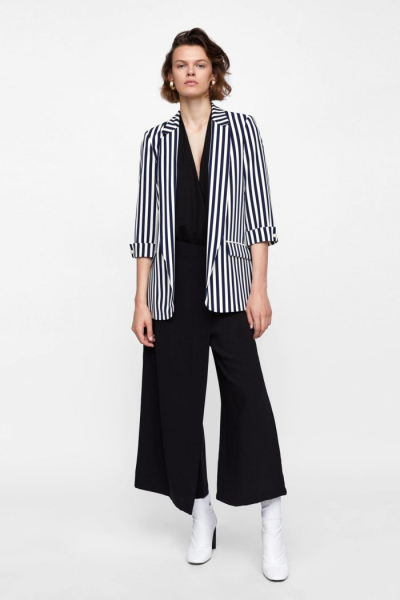 - Полоска. Пиджаки в «морском» стиле комбинируйте с синими вещами – брюками или майками под низ. А вот вертикальная узкая полоска подойдет для офисных сетов. Например, с комбинезонами с укороченными штанинами. Дополните образ белыми ботинками.
