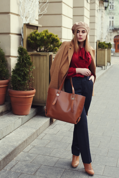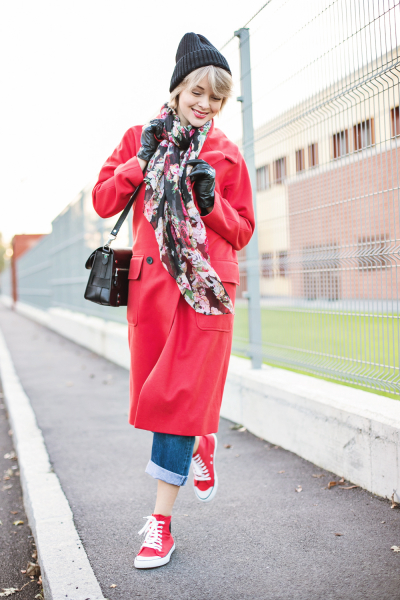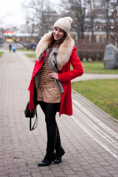 - Красное. Создать стильный лук можно с красным пальто, носить которое разрешено с беретами и шапками темно-синего, чёрного, бежевого и белого цвета. Ну а если хочется сделать образ ещё более ярким, в этом случае подойдет зелёный головной убор или цвета фуксии.