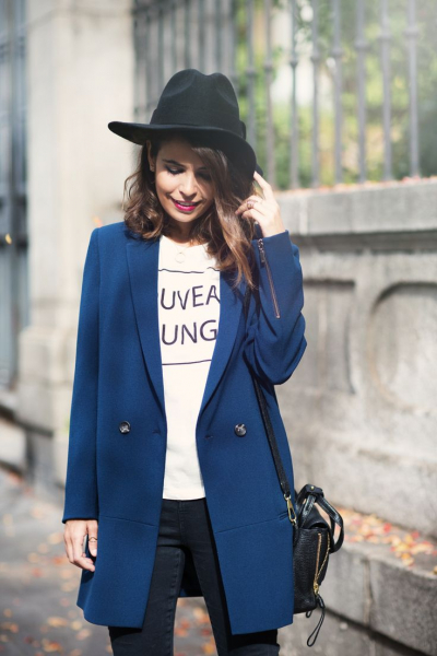 - Синее. Пальто синего цвета сочетать можно с простой вязаной шапкой, беретом, кепкой, бини или трубой синего, серого или коричневого оттенка. Уместными будут и стандартные белые или чёрные головные уборы. Поклонницы более неформальных сочетаний к синей верхней одежде подобрать могут жёлтого, зеленого или даже красного цвета шапку.