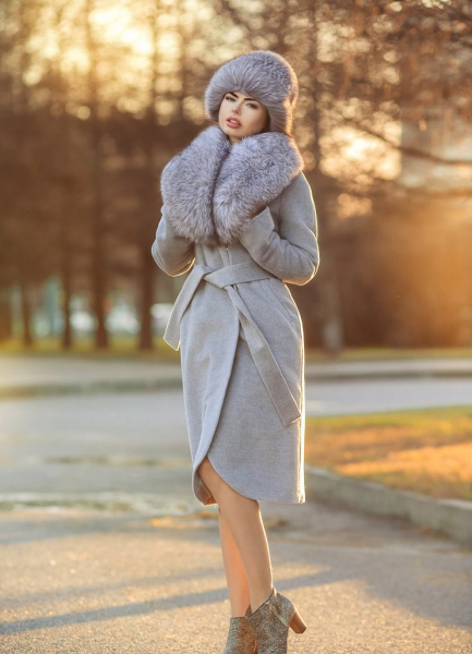 - Серое. Как уже говорилось ранее, серое пальто является весьма практичной верхней одеждой, к которой подойдет любой головной убор. Допускаются, как простые фасоны шапок такого же цвета, так и варианты с ярким дизайном и обильным количеством декора.