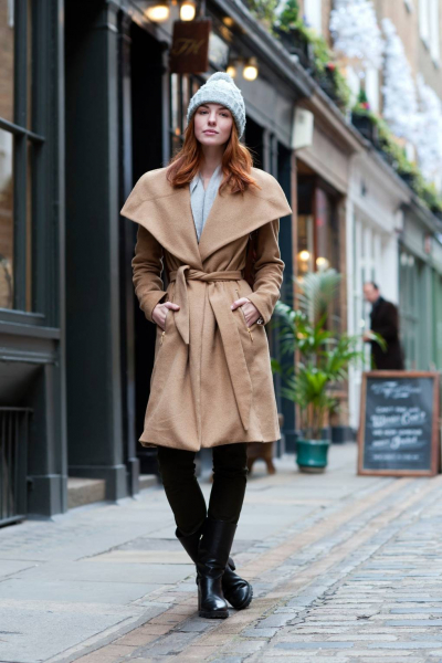 - Пальто-халат, как и двубортное, является весьма практичной верхней одеждой, к которой уместным будет любой головной убор. Это может быть широкополая шляпа, ушанка, вязаный вариант или меховой котелок.