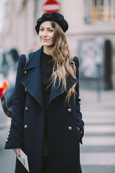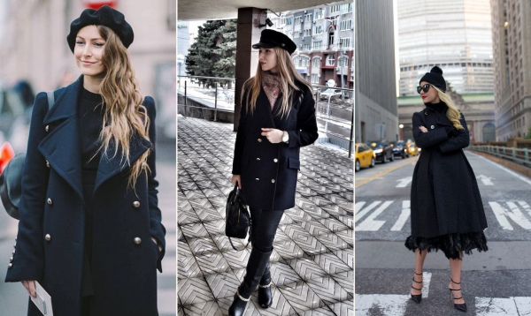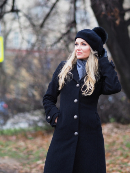 - Чёрное. Так как чёрное пальто является самым универсальным, к нему подойдет практически любая шапка. Например, с базовым двубортным хорошо будет смотреться кашемировая или вязаная модель такого же цвета или абсолютно контрастного. Также можно дополнить его изысканной фетровой шапочкой. А вот к вариантам в стиле милитари подойдут спортивные бини или же брутальные ушанки.