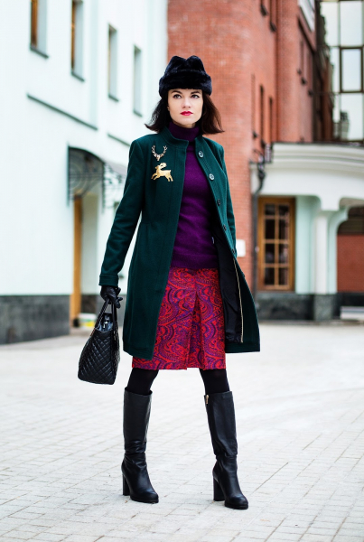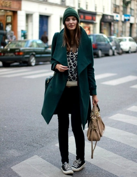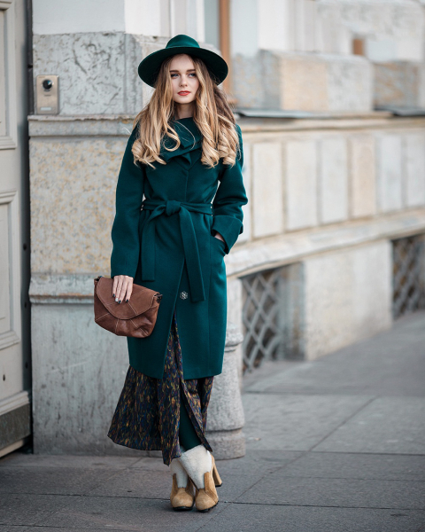 - Зелёное. Следует заметить, что к такой верхней одежде подобрать головной убор довольно сложно, поскольку она сама по себе уже является изюминкой образа. Беспроигрышным вариантом здесь будут модели белого, чёрного, бежевого и серого цвета. Также можно поэкспериментировать и с холодными оттенками сиреневого.