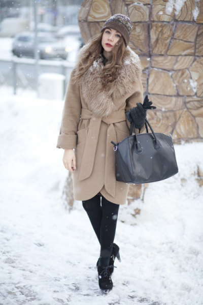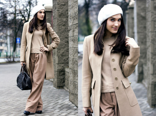 - Бежевое. Пальто бежевого цвета держится на пике популярности уже несколько сезонов подряд. Кроме того, что оно красиво смотрится, данный представитель верхней одежды ещё и легко сочетается с другими вещами, в том числе и с головными уборами. К нему подойдут модели, оформленные в этой же цветовой гамме, только на несколько оттенков темнее. Своё предпочтение можно отдать и стандартным изделиям белого или чёрного цвета. Если же необходимо добавить в образ ярких красок, это можно сделать с головными уборами синего, сиреневого, бордового или фиолетового цвета.