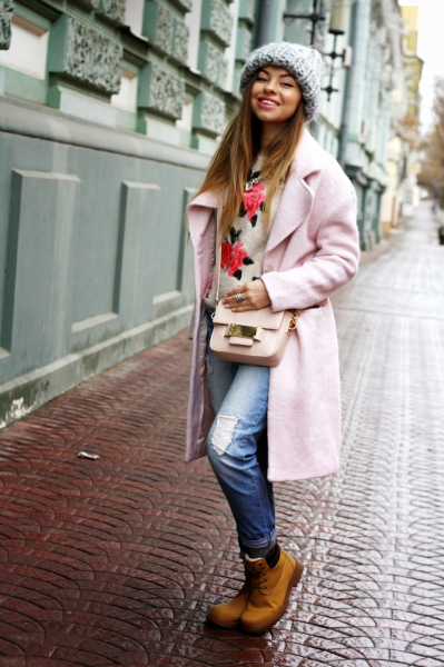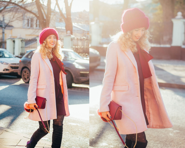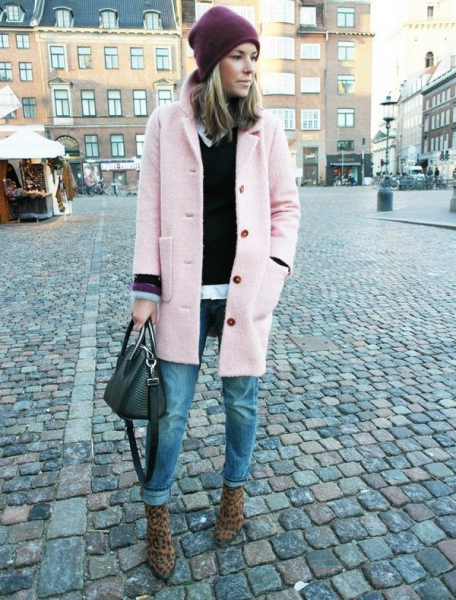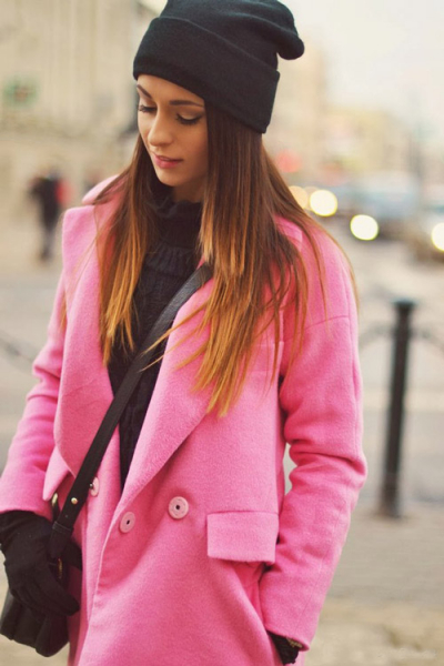- Розовое. С ним отлично будут смотреться шапки на несколько оттенков светлее или темнее. Разрешены и варианты белого, чёрного, голубого, бежевого и серого цвета.