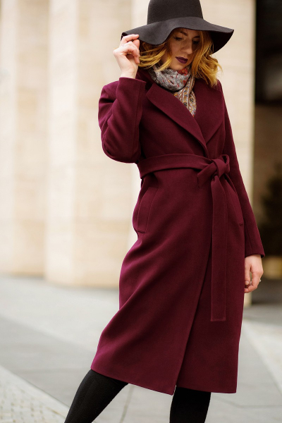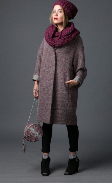 - С буклированным пальто прямого кроя надевать стоит не слишком объёмные головные уборы такие, как “чалма” или “носок”. Они могут иметь простой дизайн или быть украшенными вышивкой.