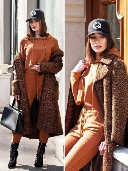 - Рыжее. Как и в случае с зелёным, к этому пальто, помимо белого и чёрного, подойдет также бежевый или темно-синий головной убор. С остальными цветами следует быть аккуратными, дабы не перегрузить аутфит.