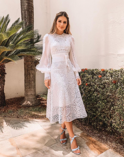 Самое модное воплощение белого платья представлено кружевными мотивами. Такой чувственный материал может быть представлен в виде отдельных вставок. Плотное кружево кроше – изысканная фактура для всего платья.