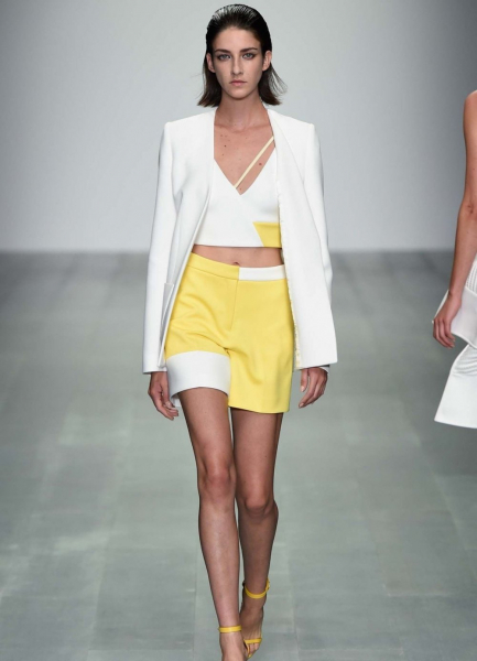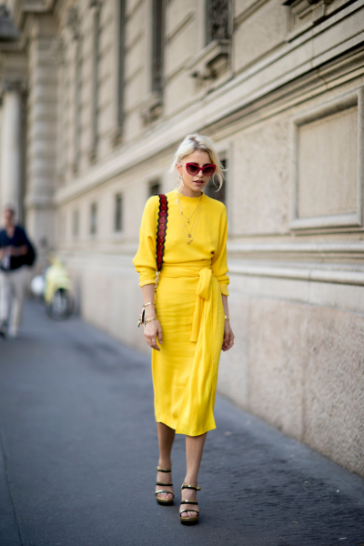 - На пике популярности и солнечный желтый цвет. К слову он отлично комбинируется с еще одной тенденцией – вещами в электрически синем исполнении.