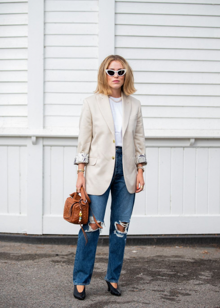 На гребне волны оказались и джинсы с намеком на оверсайз. Такие модели требуют соответствующего приталенного обрамления. Например, стильно выглядит тандем с кроп-топом и жакетом. Можно также поиграть на контрасте и сочетать джинсы оверсайз с изящной блузой из шифона и лодочками на шпильке.