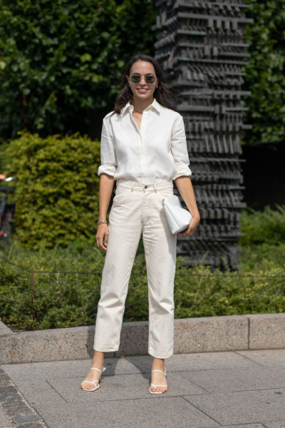 В летних образах стильно выглядят джинсы светлых расцветок. Можно подобрать любую модель – укороченные с подворотами, длинные со стрелками, бойфренды или mom.