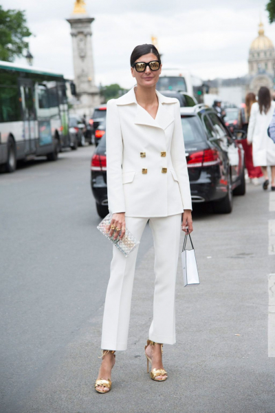 Брючный костюм в белоснежном исполнении планирует стать основой самых модных луков в летнем сезоне. Такой наряд прекрасно молодит, придает аутфиту красивую нотку роскоши.