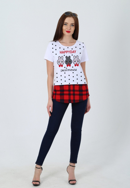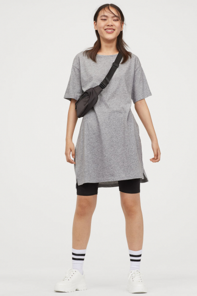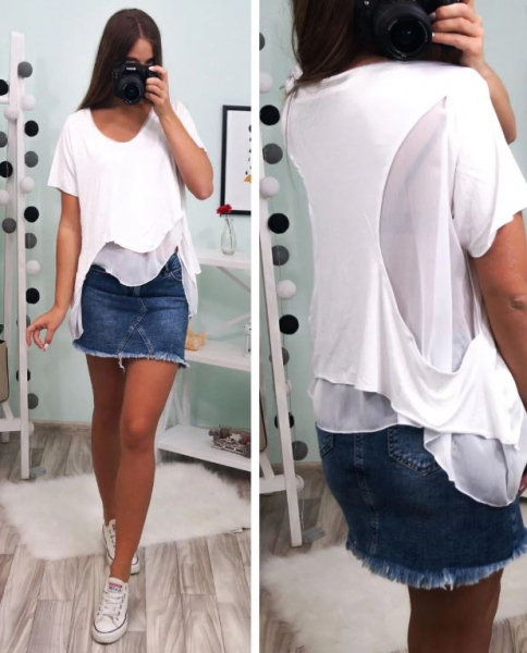 Еще один тренд 2020 года – двойные изделия. Внешне кажется, что девушка надела сразу две вещи одну на другую. При этом крой отдельных частей может существенно отличаться. Например, низ может быть выполнен из тонкого трикотажа, а верх из более плотного материала с картинкой или надписью.