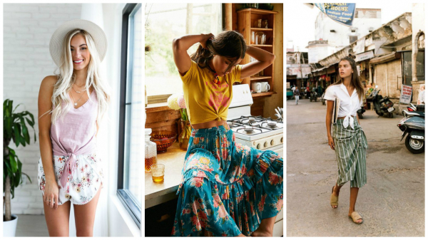 Модели, завязанные на талии, пришли к нам из 90-х. Сегодня стилисты рекомендуют располагать узел сбоку и носить такие изделия не только в рамках пляжных образов, но и как часть повседневного городского лука.