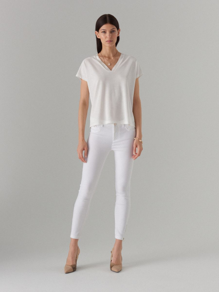 - V-образный вырез зрительно вытягивает фигуру, делает шею длиннее, подчеркивает зону декольте.