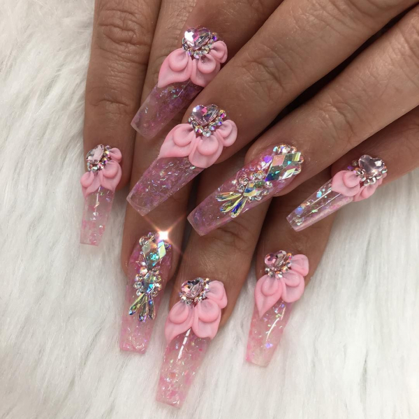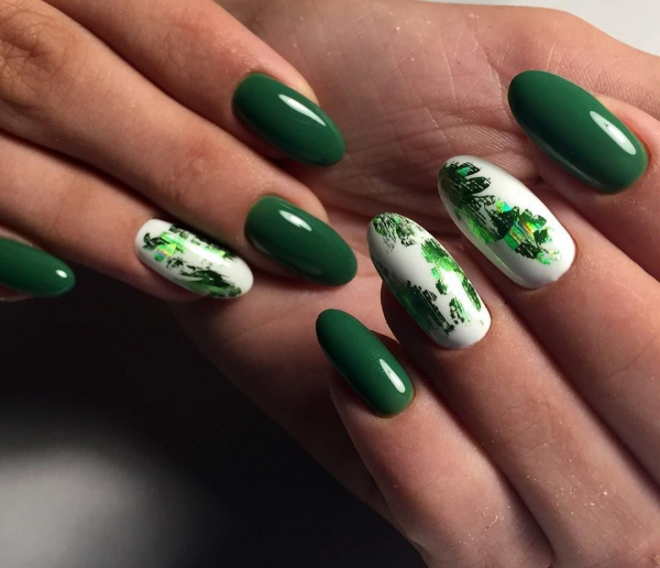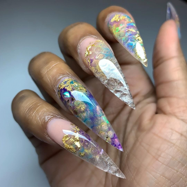 - Аквариум, когда финальная отделка производится прозрачным гель-лаком или акрилом, что создает эффект трехмерности. Кажется, что элемент рисунка находится как будто под стеклом. Этот дизайн на длинных ногтях может удивить многочисленными сочетаниями принтов, к тому же хорошо закрепляется.