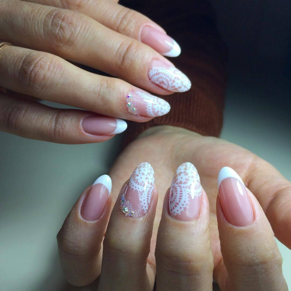 - Френч в сочетании с гипюровой сеточкой. Кружево в тренде и не собирается уступать свое законное место.