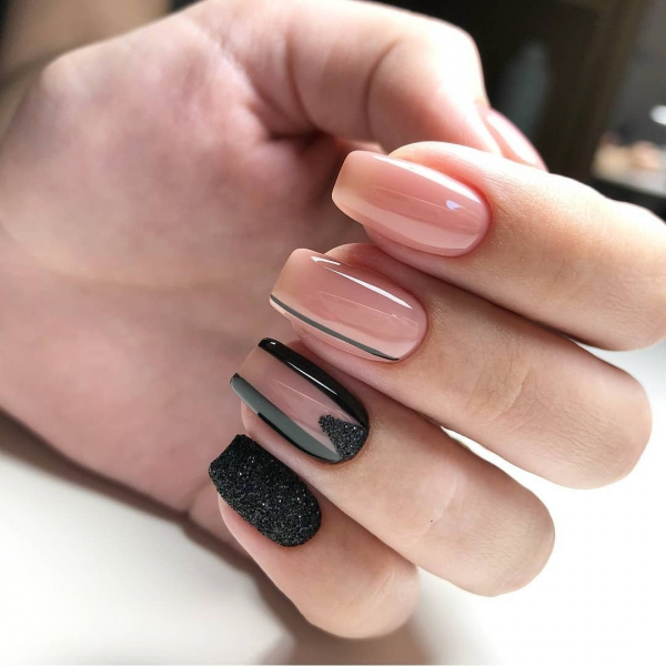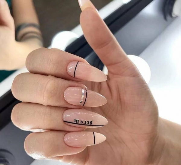 Только покрытие в этом случае нужно делать однотонным, чтобы дизайн не был слишком громоздким. Хорошим дополнением станет размещение глиттера или фольги на отдельных ногтевых пластинах. Самое популярное исполнение — черные надписи на бежевом или розовом фоне.