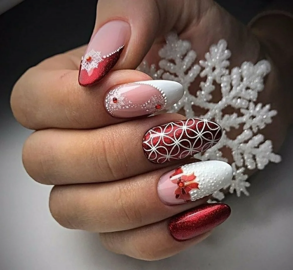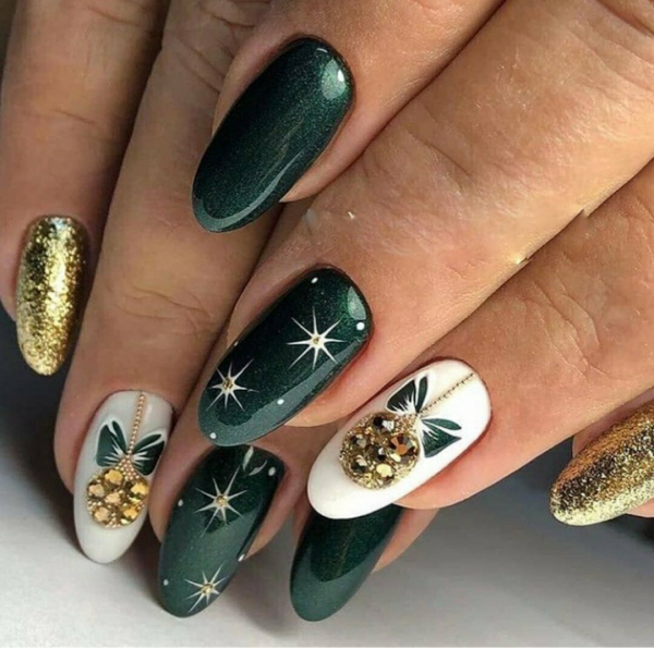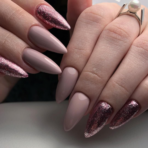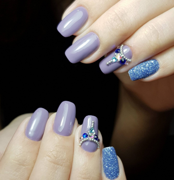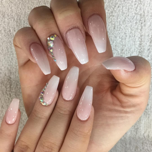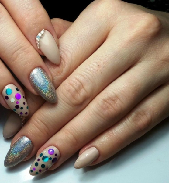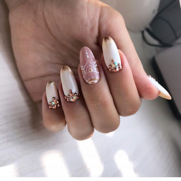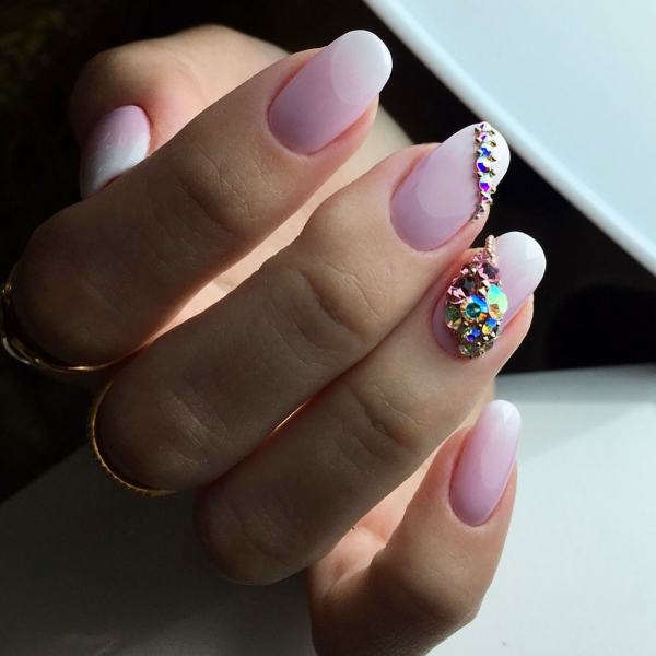 Для праздничного образа подойдет комбинация из омбре или градиента со стразами, блестками, бусинами, камушками. Под эти украшения можно выделить отдельный ноготь.