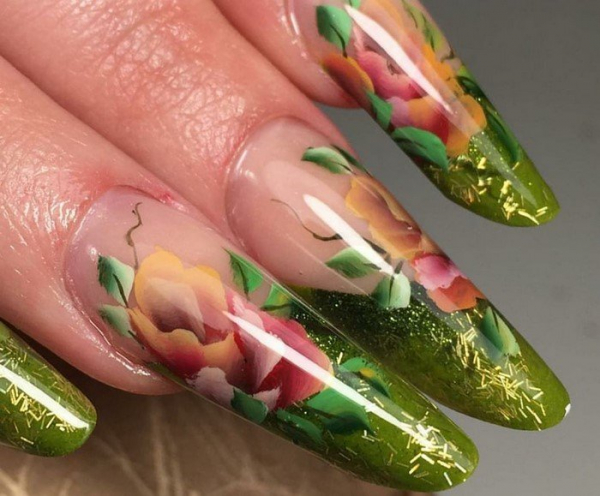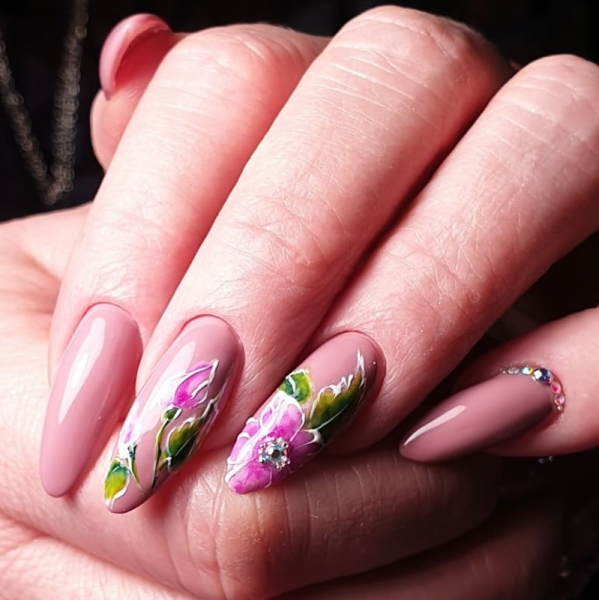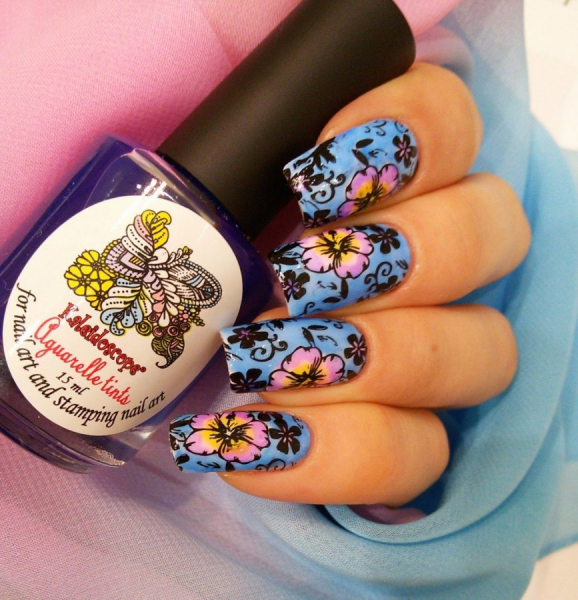 - Роспись акварелью поверх гель-лака. Рисунки выполняются в виде нежных образов с плавными переходами от одного тона к другому, от одной грани к другой.
