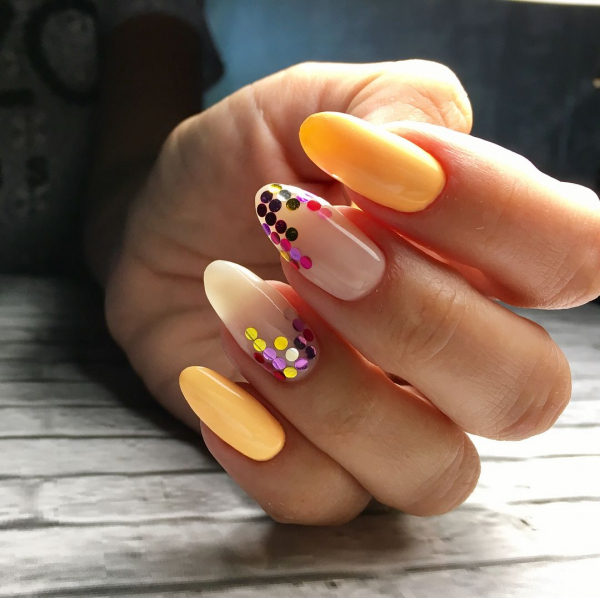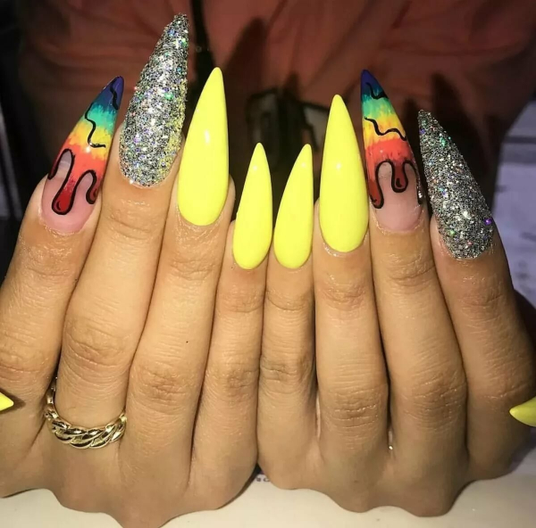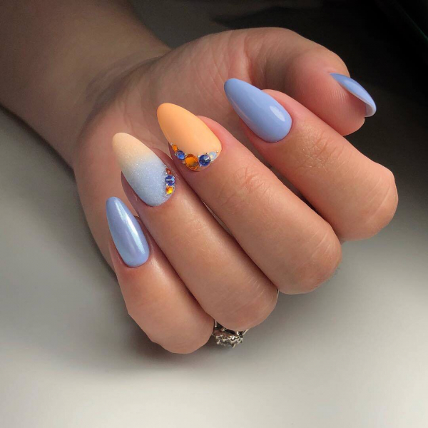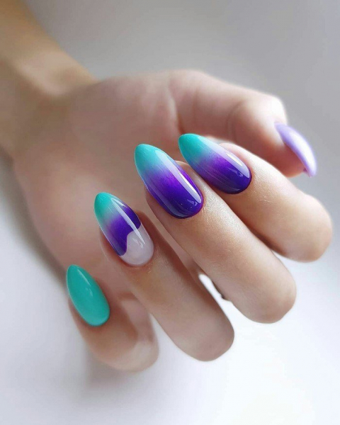 - Яркий омбре, когда один цвет переходит в другой, например, желтый в синий или голубой. Модный вариант — не линейный омбре, а диагональный.