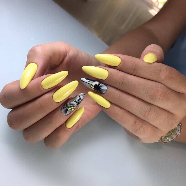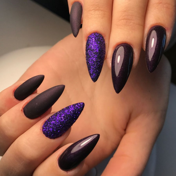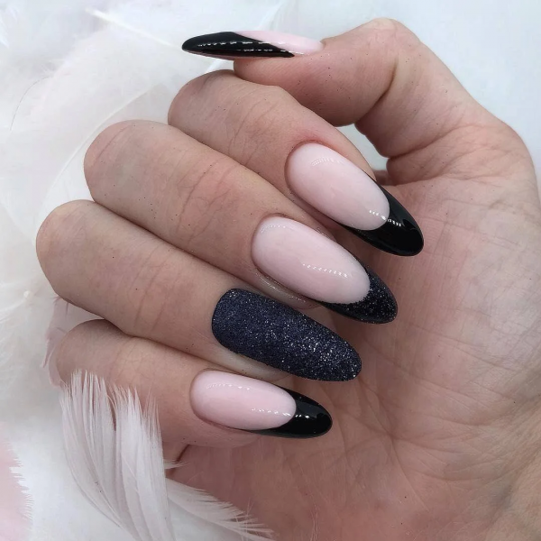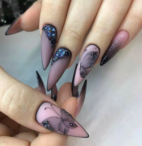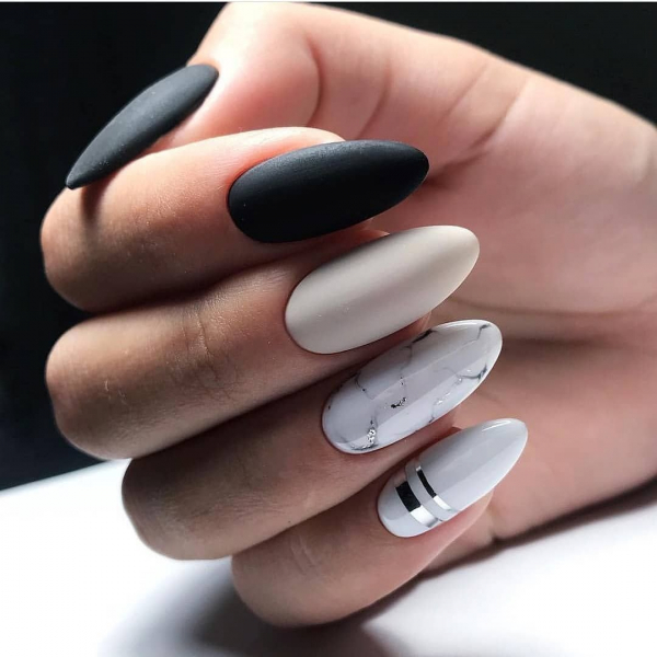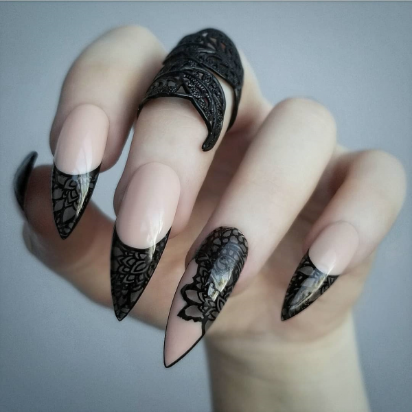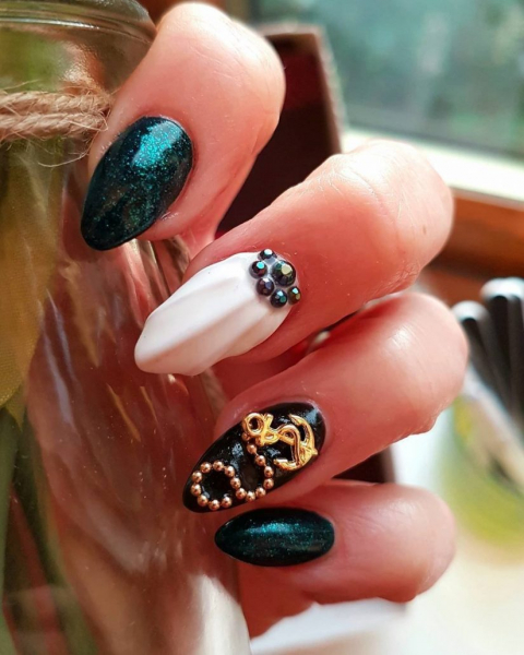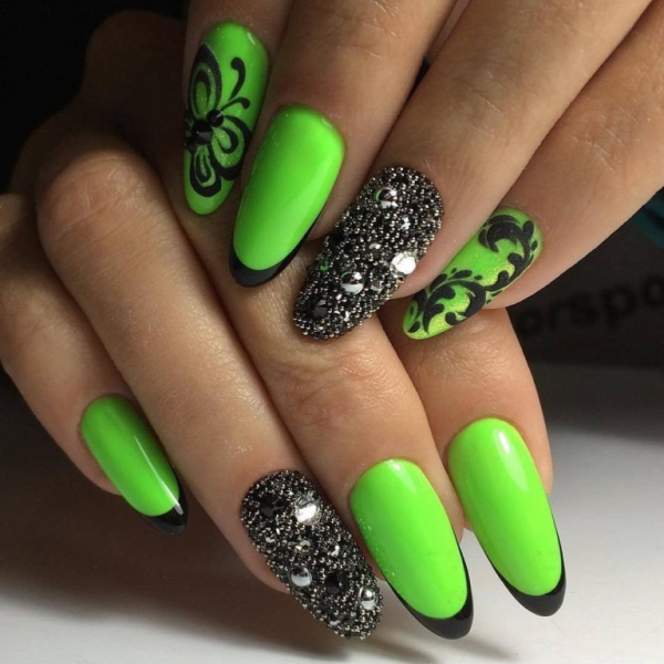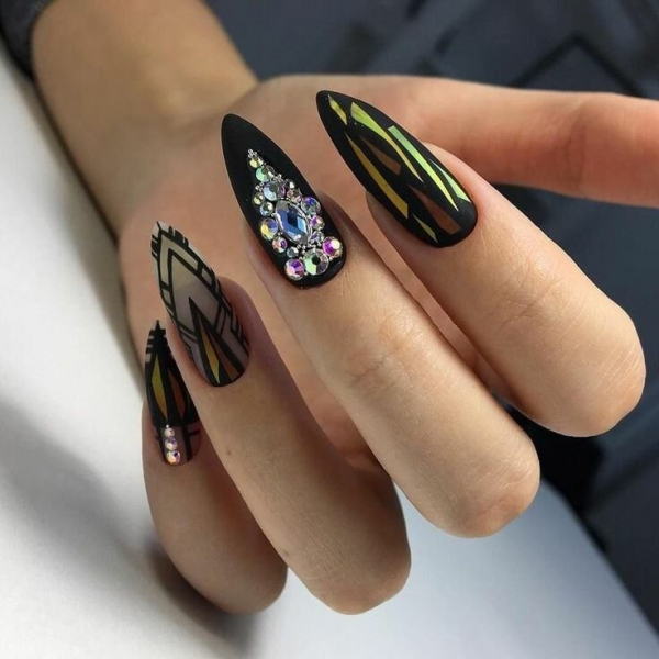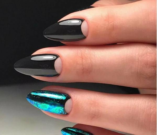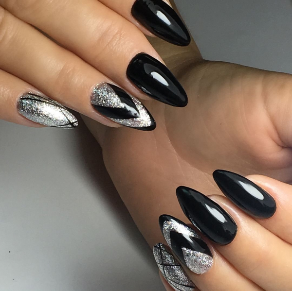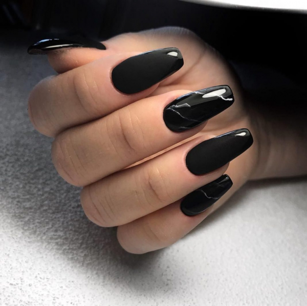 Для торжественных случаев широко используется черный цвет, но в тандеме с украшениями и другими оттенками. В противном случае он выглядит на длинных ногтях слишком мрачно и трагично.