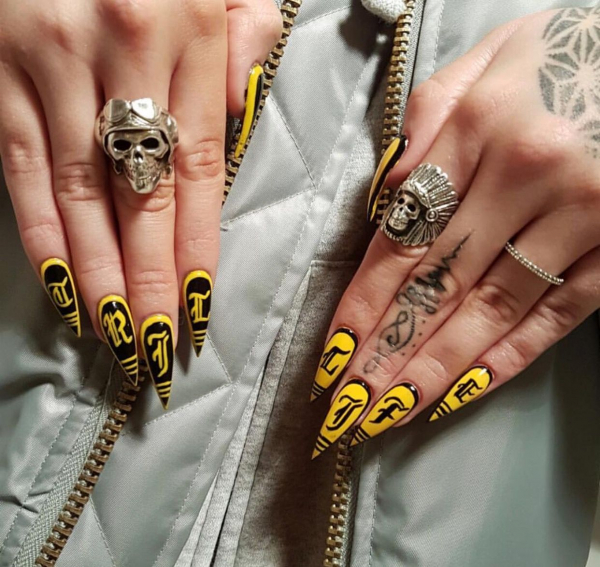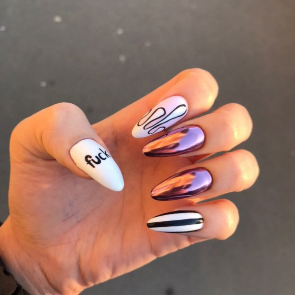 - Надписи. Это популярный способ декора, на длинных ногтях возможностей по формированию фраз гораздо больше. Можно поместить одинаковые или разные надписи даже на все пластины, это тоже смотрится интересно.
