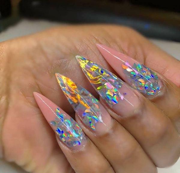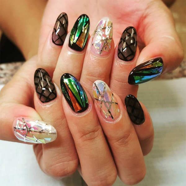 - Битое стекло. Декор создается при помощи кусочков фольги с намеренно острыми краями.