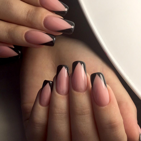 - Обратный френч-маникюр с негативным пространством в лунке. Например, темный обычный френч — это слишком тривиально. А вот темный обратный френч с «улыбкой» в основании ногтя, выполненной прозрачным лаком, украшенной стразами, это свежо и необычно.