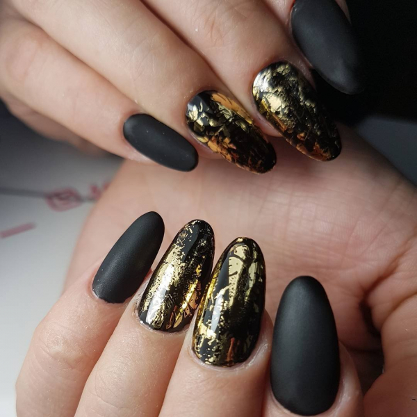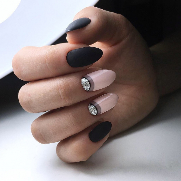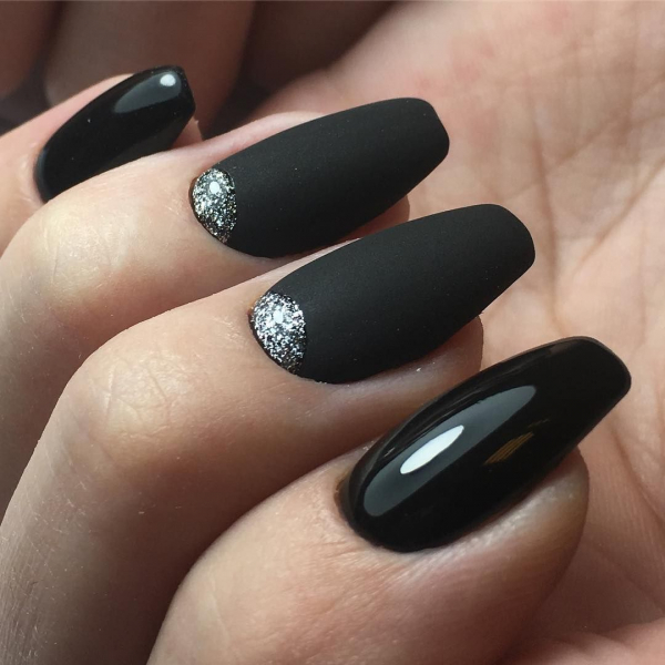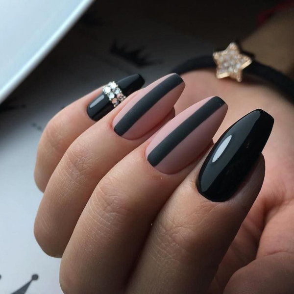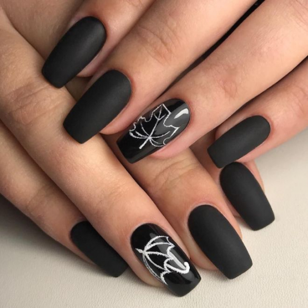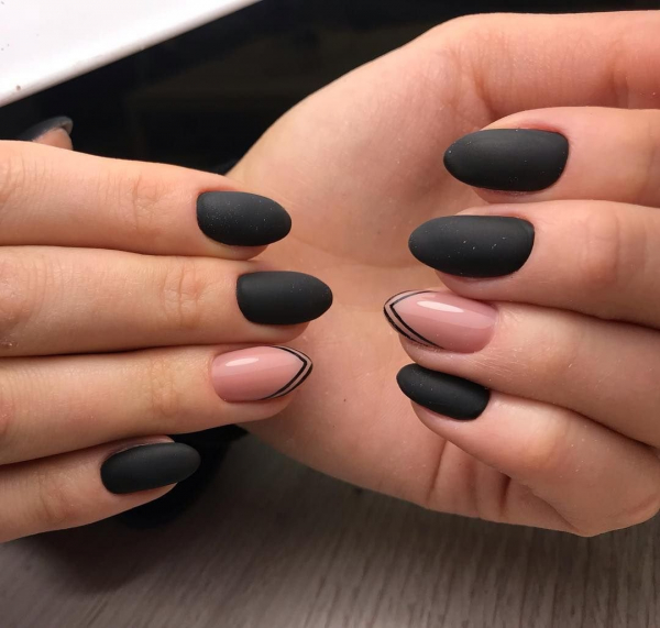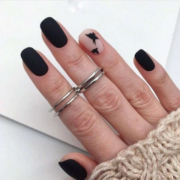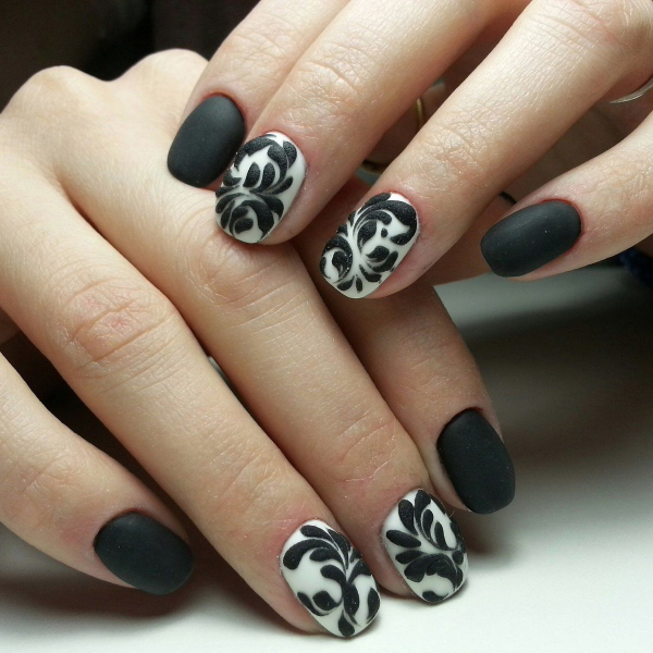 Например, на безымянный и средний палец можно нанести черную основу в мате и глянцевый изящный узор. Это красиво, интересно, беспроигрышно.