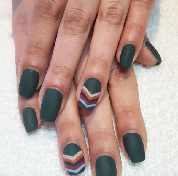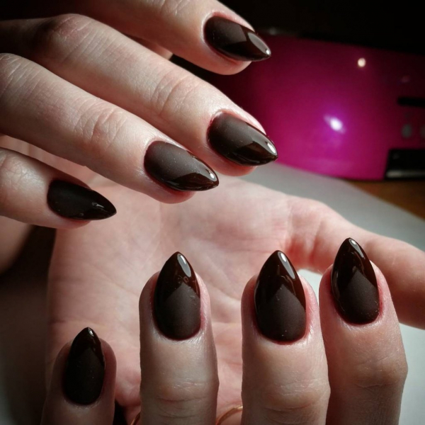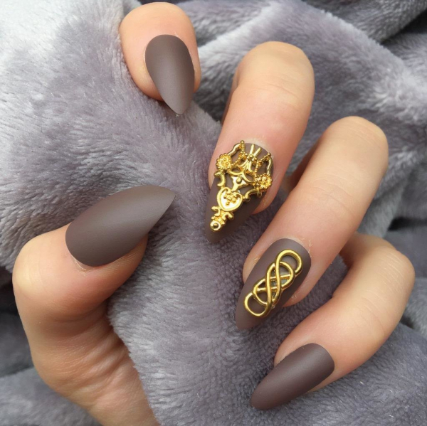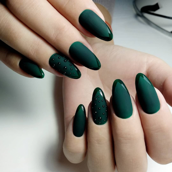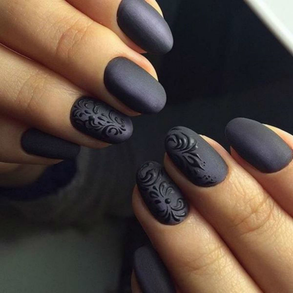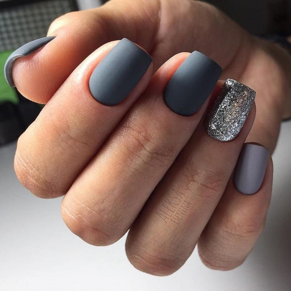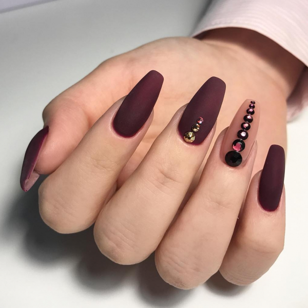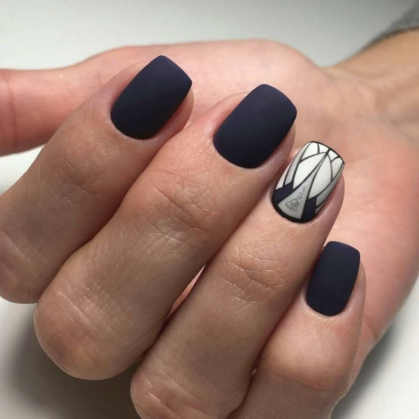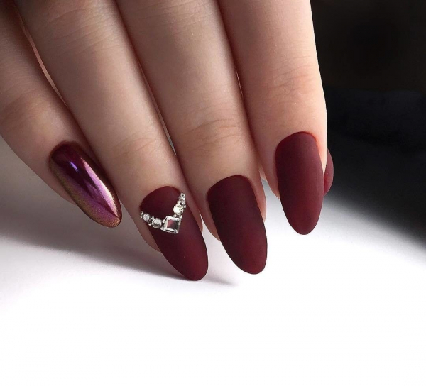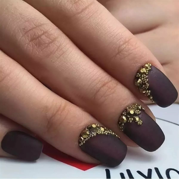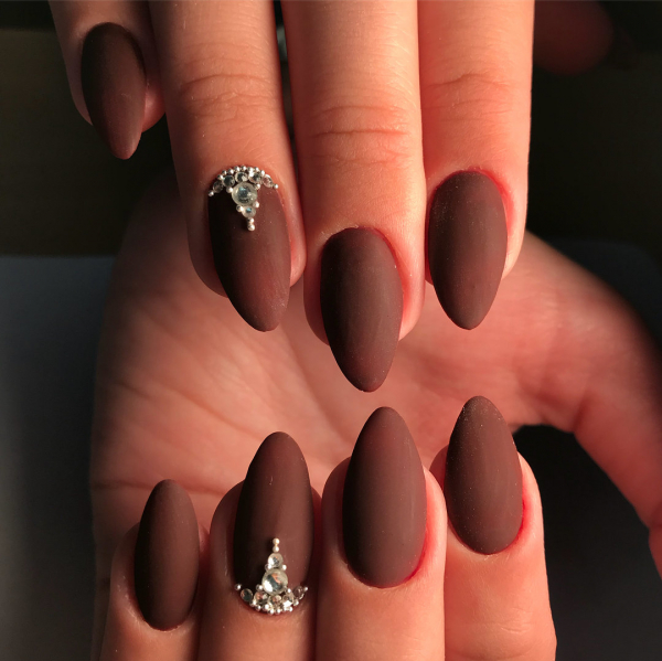 Самый выигрышный вариант — темное матовое покрытие на коротких ногтях. Это красиво, но небольшая шалость в виде стразы или одиночной бусины образу не повредит.