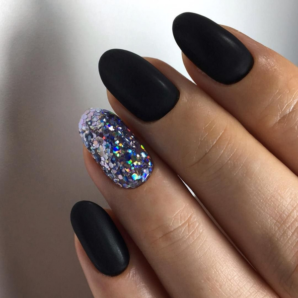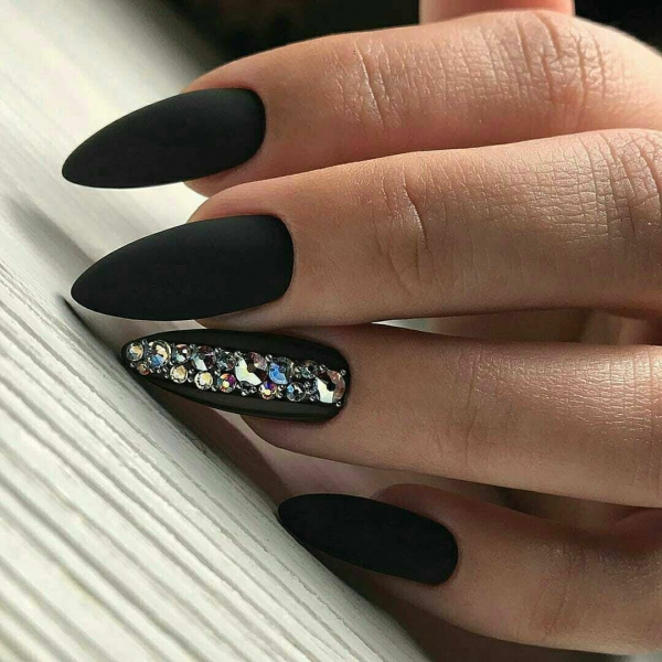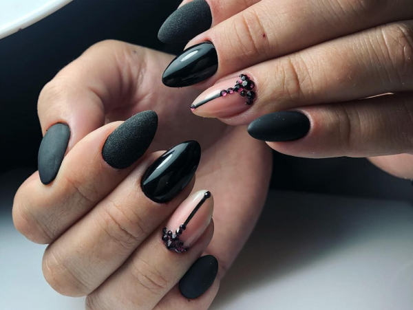 Тотал блэк вполне допускает отдельные украшения или даже целые островки из стразов и блесток, например, на мизинце или указательном пальце.
