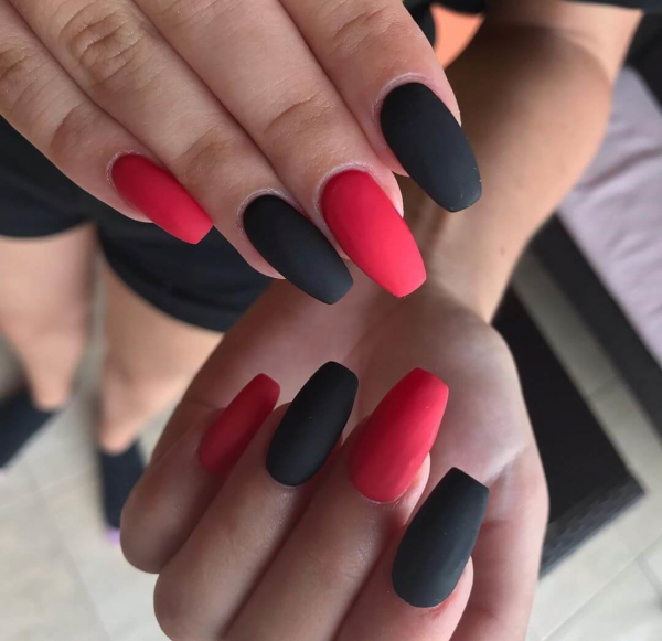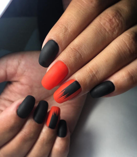 - Красные и черные ногти с матовым покрытием в одном маникюре. Такой нейл-арт не терпит соседства других украшений.