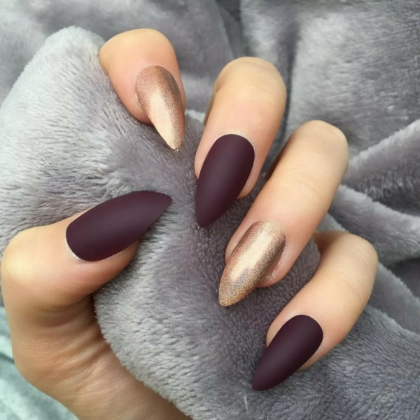 Очень модной сейчас является форма «балерина», комбинация квадрата и миндаля с умеренной длиной. Края, грани ногтевой пластины получаются слегка скошенными. На форме «балерина» матовый лак выглядит особенно выигрышно, эффект бархата на ней получает глубину и особый эффект.