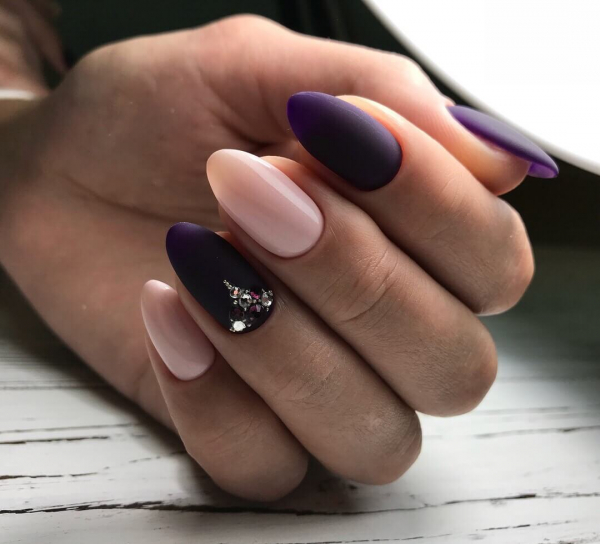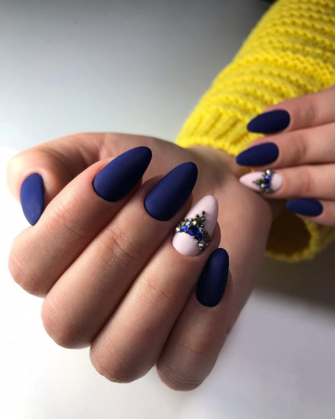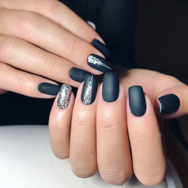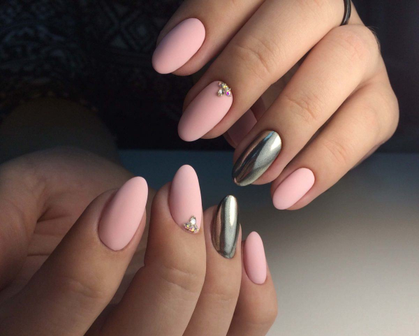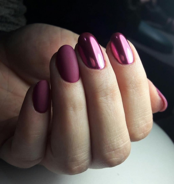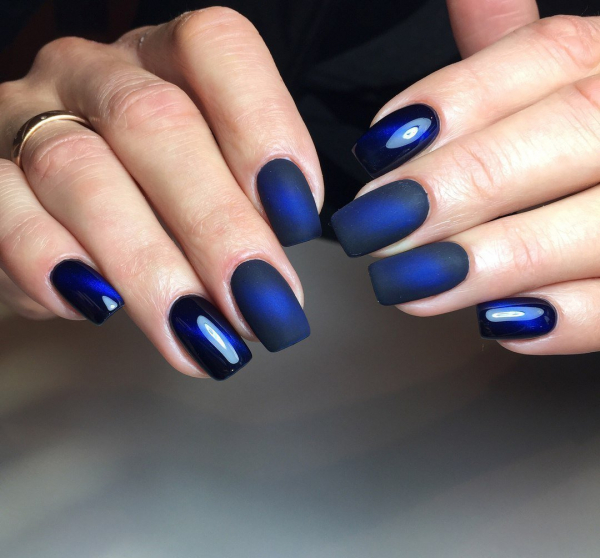 - Мат вперемешку со втиркой, особенно жемчужной или зеркальной. Пример красивого дизайна — однотонное матовое покрытие, угольное или темно-синее, с акцентом на мизинце или безымянном пальце при помощи зеркальной втирки.