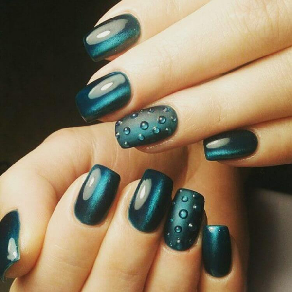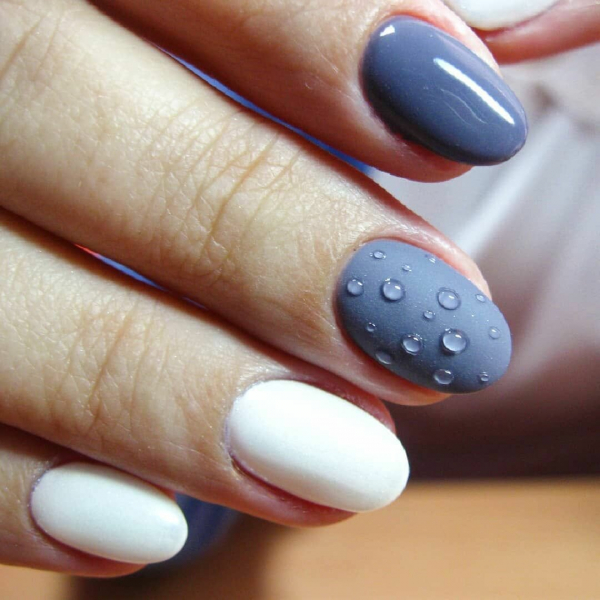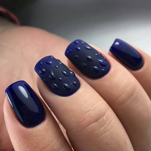 - Капельный дизайн. Имитация росы из глянца на пальчиках не утрачивает актуальности уже несколько лет подряд. Когда на матовое покрытие аккуратно наносятся глянцевые пузырьки геля, это создает неожиданный эффект.
