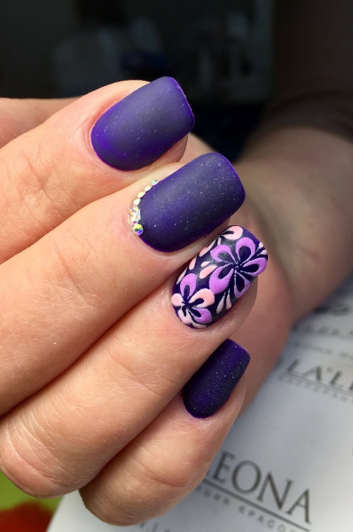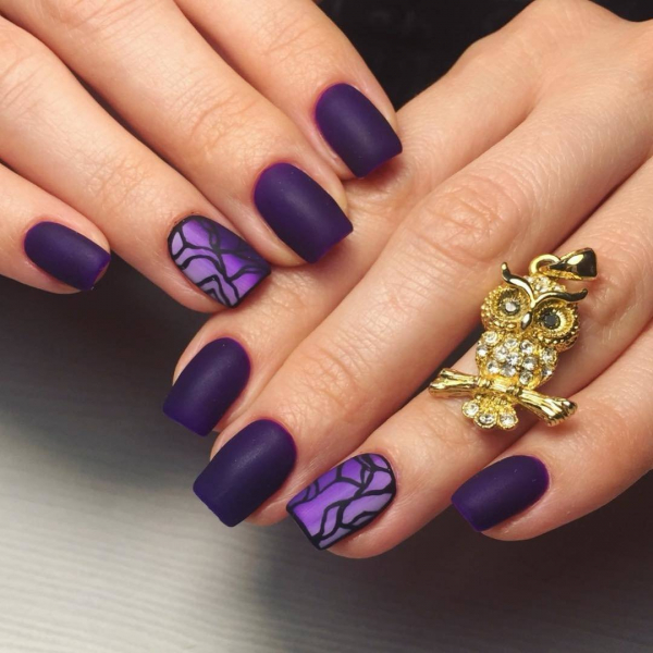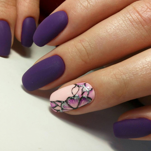 - С рисунками. Глянцевый узор, нанесенный поверх глубокого и насыщенного мата. Рисунки можно нанести и на все ногти, но выигрышно выделяться они будут на некоторых ногтях.
