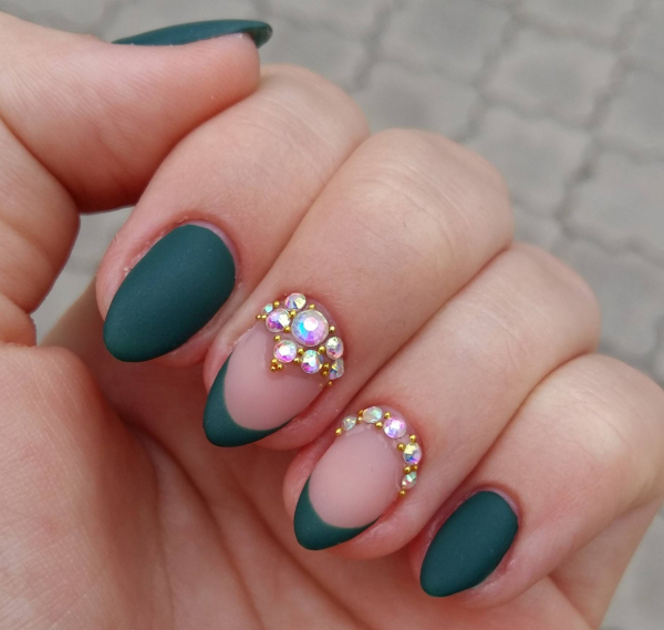- Матовый маникюр с блестками и со стразами, причем в сочетании. Из блесток можно выполнить «улыбку» в маникюре френч, срединные полоску или дорожку (в один или несколько рядов). Такой декор допустим и из бусин, мелких камушков.