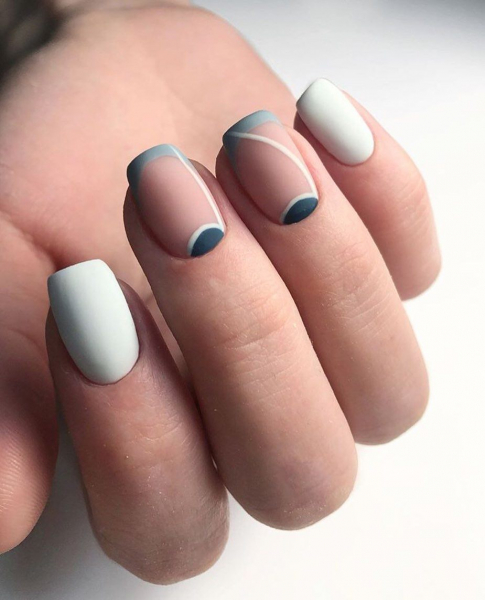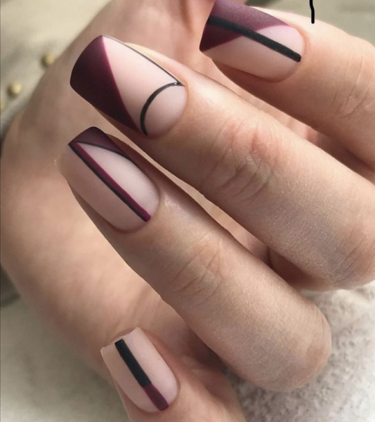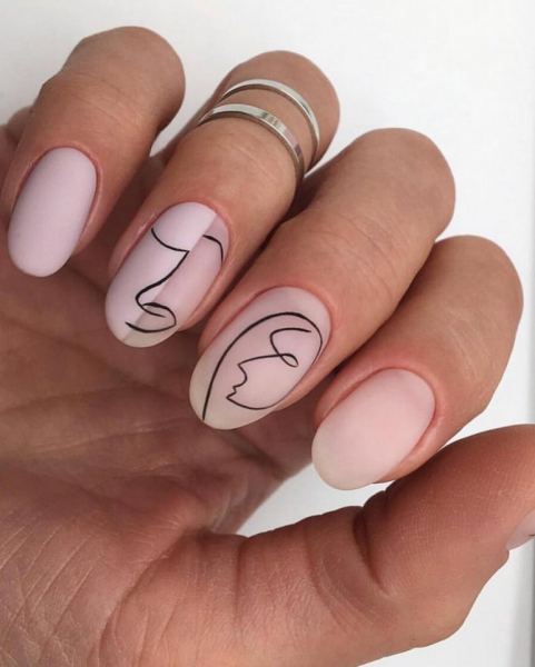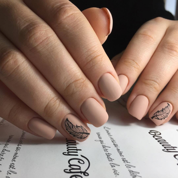 - Нюдовое покрытие, мат и трафаретные рисунки в стиле deep desine.