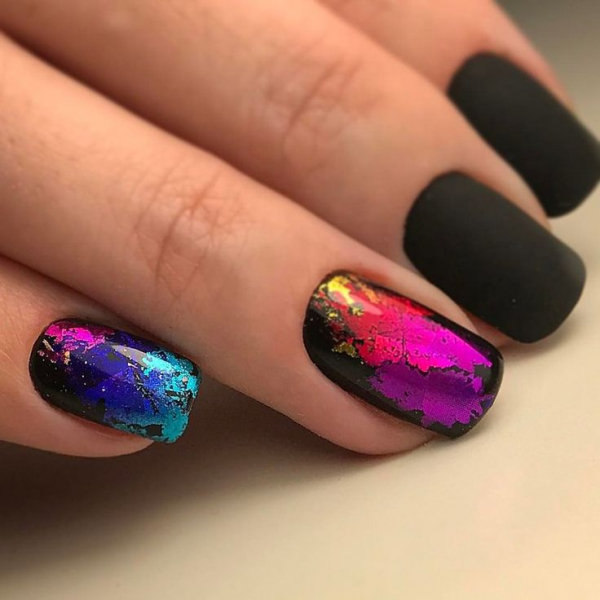 - Сочетание мата и разноцветной или однотонной фольги. Покрытие насыщенного цвета в сочетании с «улыбкой» из фольги в том же тоне или чуть темнее смотрится очень нетривиально.