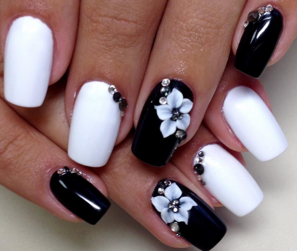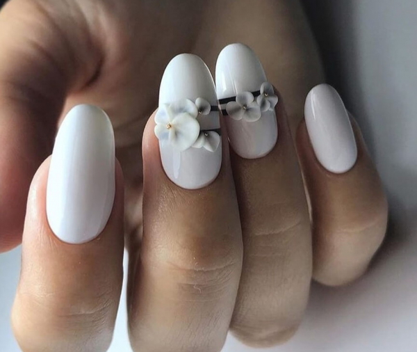 Безупречным и нежным получится дизайн, если покрыть все ногти белым оттенком, два акцентных ногтя украсить темными толстыми полосами поперек поверхности, а на них разместить миниатюрные белые цветы.