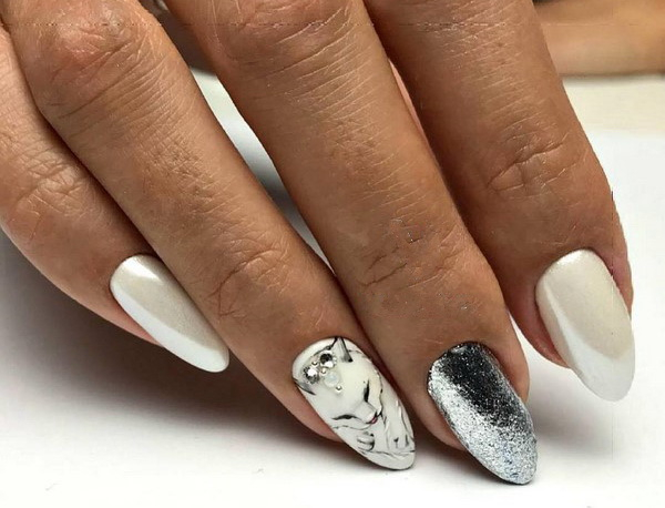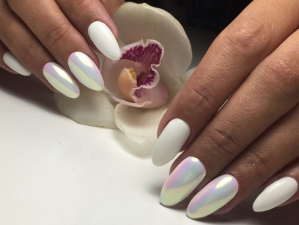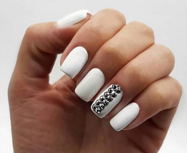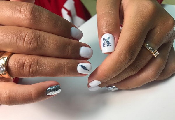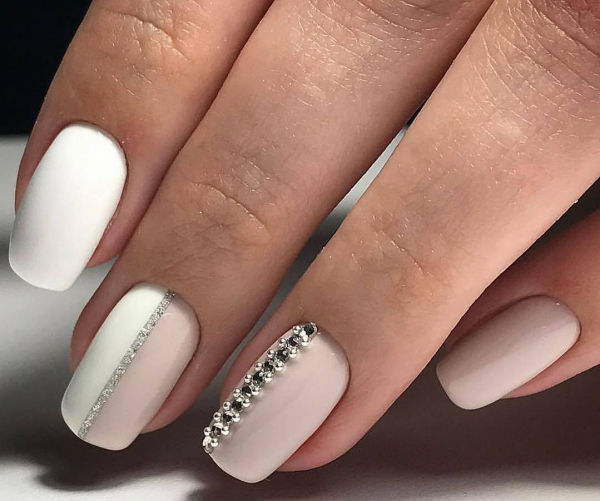 В лаконичном исполнении белый цвет можно будет сделать более интересным, если добавить к нему жемчужную втирку или бархатный эффект. Модным будет и дополнение такого маникюра глиттером на акцентных ногтях.