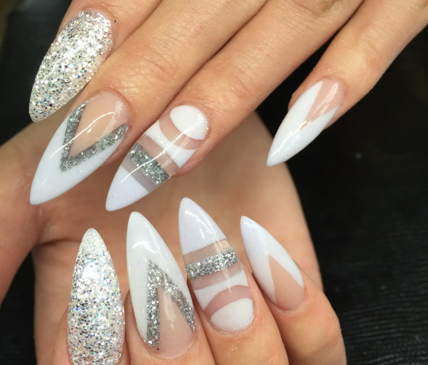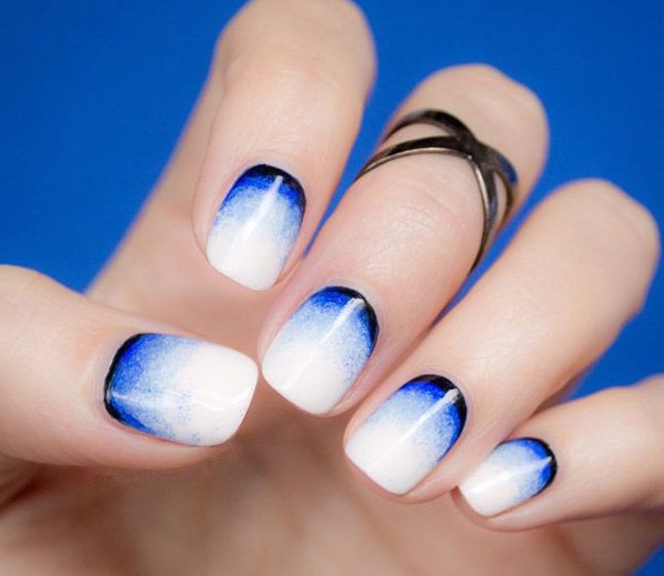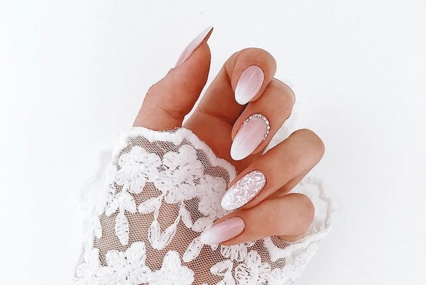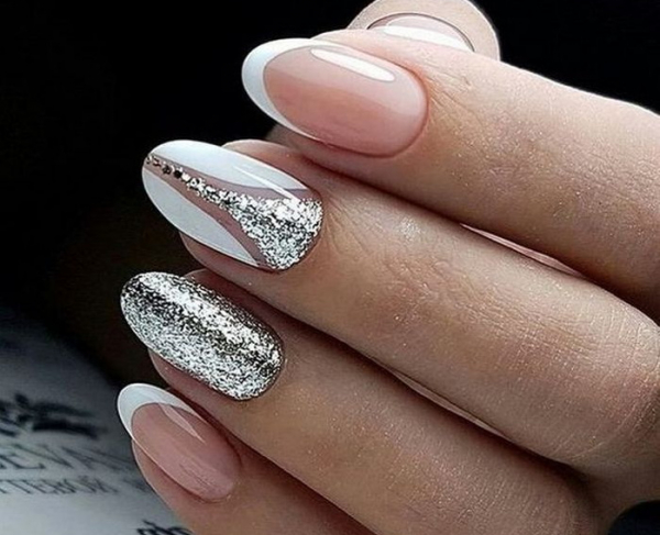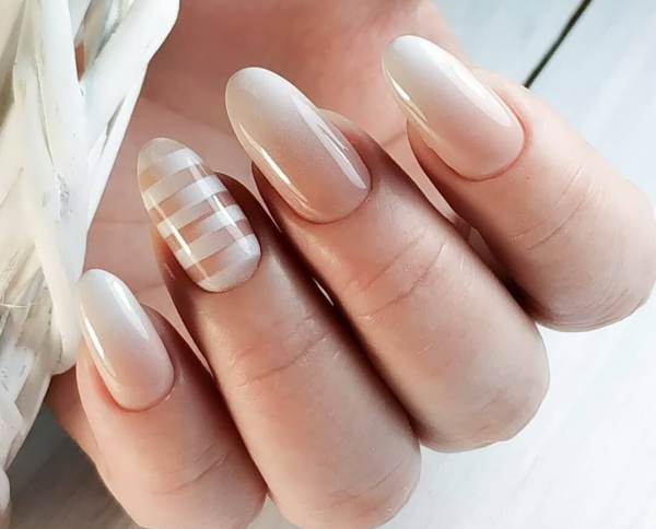 Для плавного градиента белый цвет будут сочетать с нюдовыми оттенками, пастельными и даже черным. Роскошный дизайн для вечерних луков можно выполнить, если белый гель-лак дополнить растяжкой серебристого глиттера.