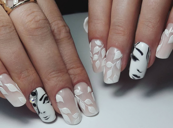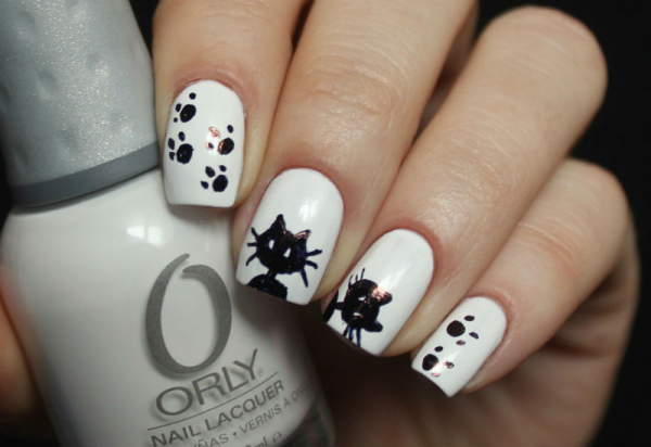 Рисунки отлично сочетаются с блестками и стразами. Можно украсить их хрустальной крошкой. На лето интересным вариантом станет дизайн с яркими экзотическими фруктами. Молодежный маникюр в белом цвете можно дополнить веселыми персонажами или следами кошачьих лапок.