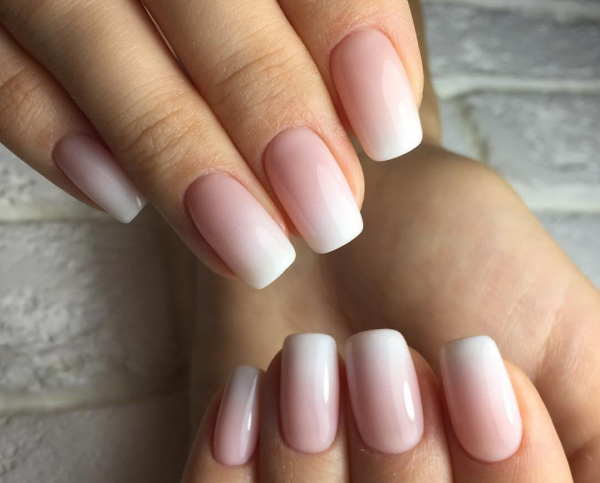 В 2021 году набирает обороты популярность линейного омбре. Среди последних новинок такой градиент представлен в разных оттенках. Этот дизайн прекрасно ложится на мягкую квадратную форму коротких ногтей. Белый цвет комбинируют с небесно-голубым, бледным желтым и светло-розовым.